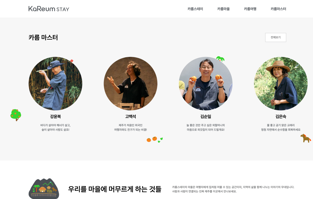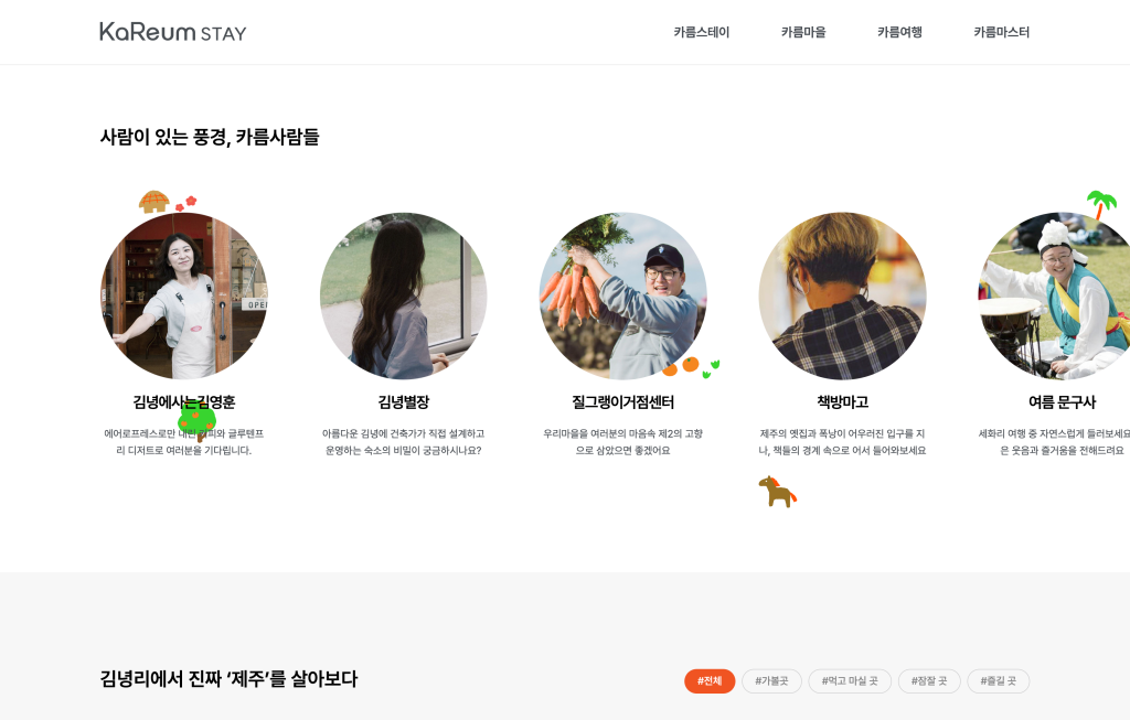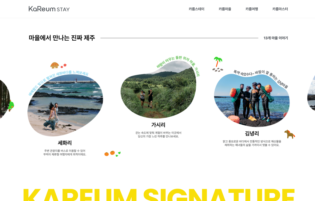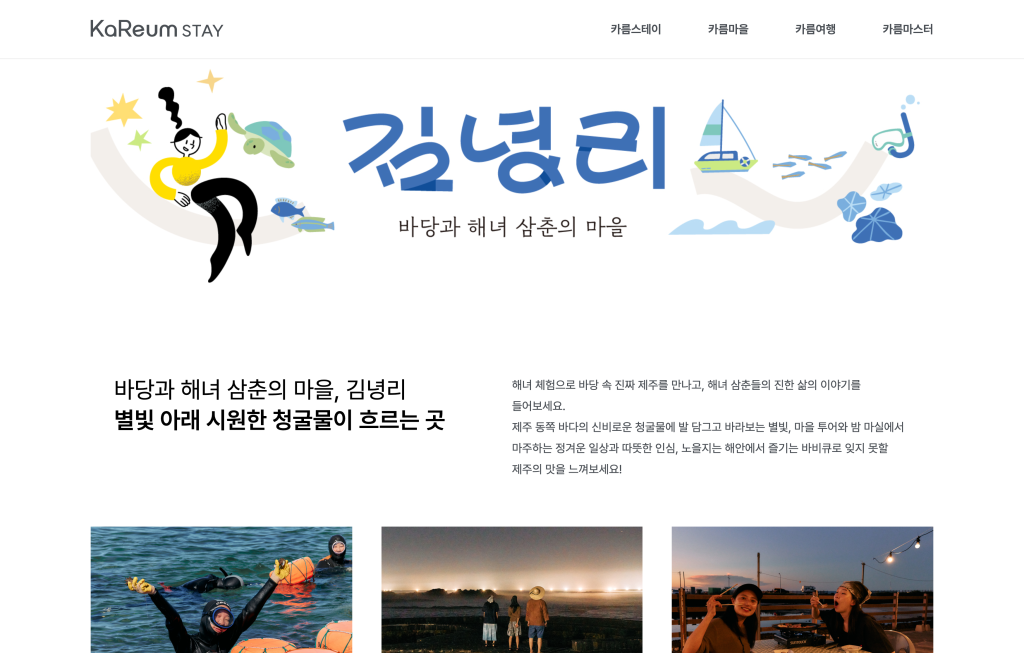 우리가 잘 몰랐던 제주의 작은 마을들에서 시작되는 특별한 여행 이야기, 제주 마을에서 깊은 숨을 쉬면서 머무는 여행이 바로 카름스테이입니다.
